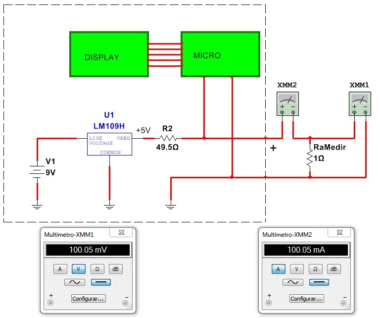 El simple circuito de la figura es una fuente de corriente constante de 100 mA. Es decir que no importa el valor de carga "R a Medir" la corriente por el circuito es siempre del mismo valor. El límite del resistor más alto que se puede medir es aquel resistor que con 5V hace circular por sí mismo una corriente de 100 mA; es decir R = E/I = 5/0,1 = 50 Ohms.