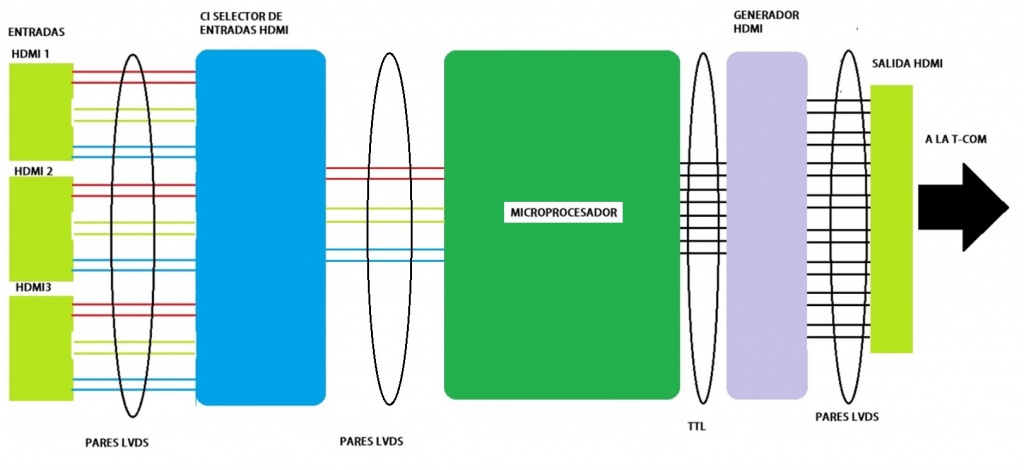 Analicemos la figura. Comienza en las tres entradas independientes de HTMI que van de la pata N° 1 a la 6 y que se aplican a un circuito integrado conmutador de entradas. El mismo circuito tiene una sección separada que conmuta las señales de audio sincrónicamente con la de video HDMI 1, 2 o 3. Todas las entradas de video de todos los TVs son del tipo LVDS y de tres pares: rojo, verde y azul.