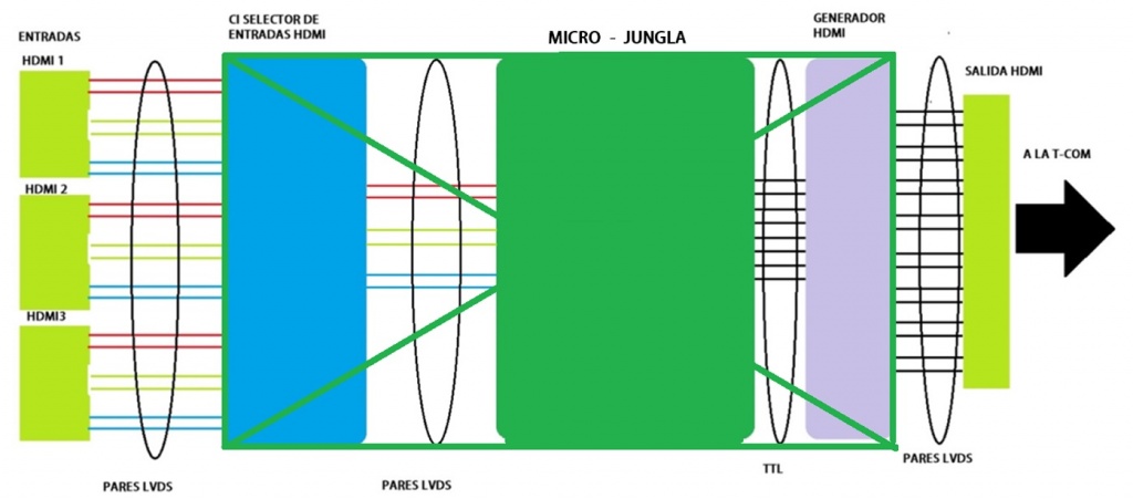 El circuito integrado generador de señales HDMI de salida, suele estar lo más cercano posible al microjungla por lo que no suele ser necesario utilizar conexiones HDMI y solo basta utilizar conexiones TTL (Si el lector tiene dudas sobre el tema le aconsejamos leer el apéndice posterior a este artículo).