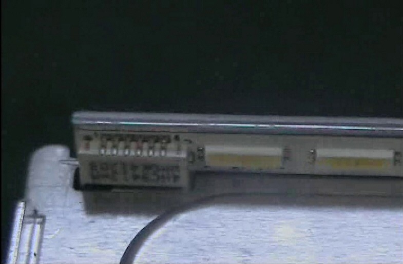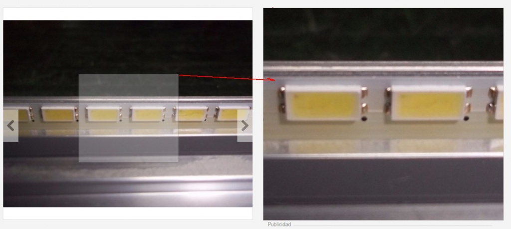 Los primeros TV led que salieron al mercado tenia iluminación en los 4 lados de la pantalla difusora de Lucite, pero en el momento actual las pantallas difusoras progresaron mucho y están compensadas para utilizar solo alimentación en uno solo de los lados mayores (generalmente el inferior). Así que suelen utilizar una plaqueta larga y angosta con unos 60 leds en serie. En la figura 1.4.2 se puede observar la punta de esta plaqueta que posee el conector de alimentación y los primeros dos LEDs.