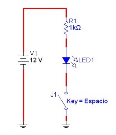 Cuando se cierra J1 el diodo LED azul queda conectado a la fuente de CC por intermedio del resistor R1 de 1K. Pero en realidad deberíamos considerar que dentro del diodo LED se encuentra un impedimento a la circulación de electrones que es la barrera del diodo.