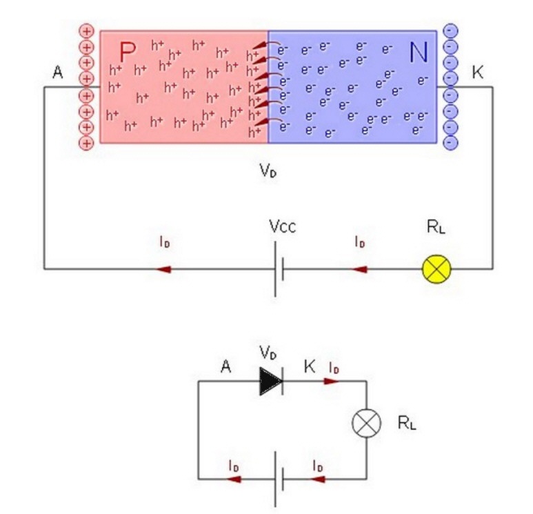 El diodo está fabricado con un material cristalino dopado de forma tal que tiene una zona con exceso de electrones y otra con falta. En la zona de unión se produce una recombinación de modo que se forma una barrera de potencial. Hasta que la tensión aplicada no supere esta barrera no hay circulación efectiva de corriente y por lo tanto no hay posibilidad de que se produzca trabajo alguno en el dispositivo. Ver la fig.1.1.2.
