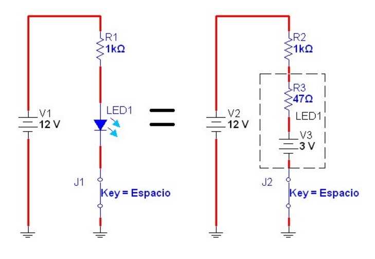 Como vemos la fuente equivalente a la barrera, se resta de la fuente del circuito, de modo que la parte resistiva del mismo tiene aplicada una tensión igual a 12V – 3V y la corriente es igual entonces a 9V/1047Ω = 8,6 mA. Observe que la parte resistiva tiene una componente que forma parte del diodo LED y otra que es la componente externa agregada para limitar la corriente del circuito a un valor que no dañe al LED.