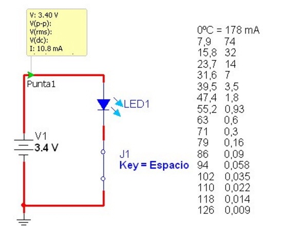 Tomemos como ejemplo a un diodo azul y por intermedio de una simulación calculemos la corriente a diferentes temperaturas. Ver la figura 1.2.1.