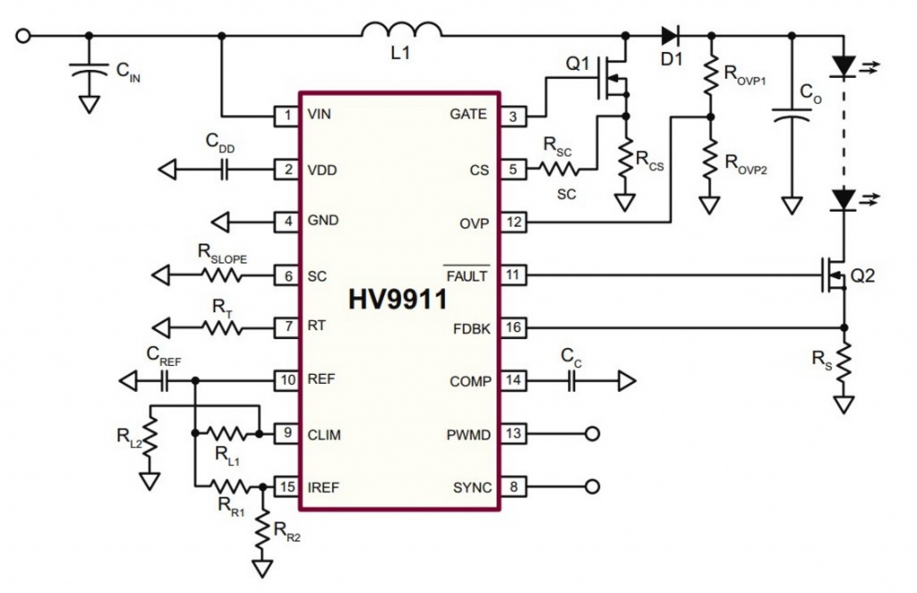 En el momento actual hay un circuito integrado para cada uso específico y no podía faltar uno adecuado para realizar la fuente de corriente que estamos necesitando. Este integrado muy conocido es el HV9911 que podemos considerar como un conversor tensión/corriente de alto rendimiento para una cadena de LEDs.