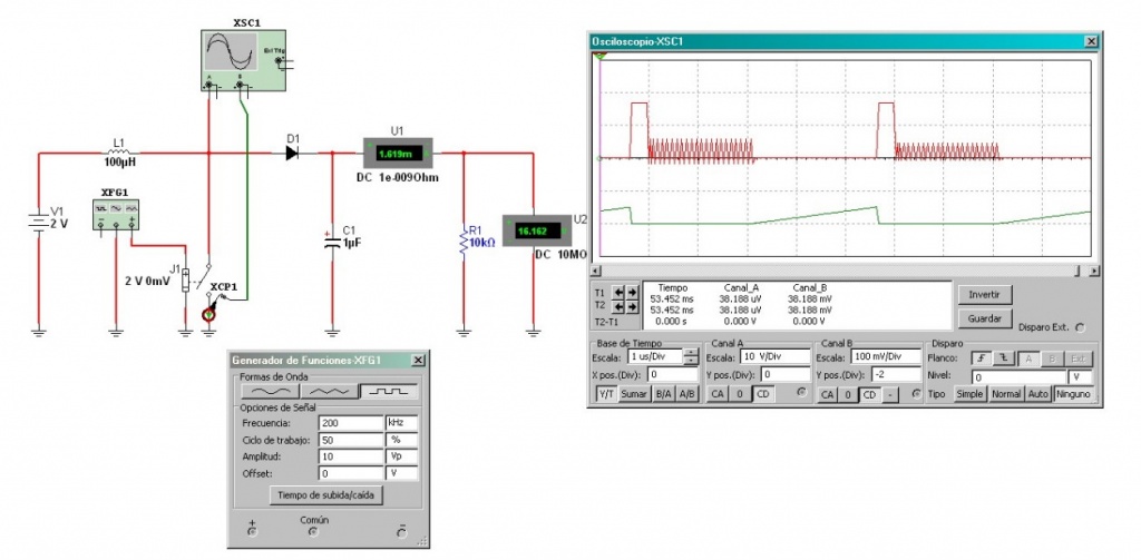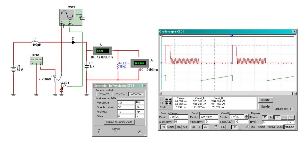 El funcionamiento del circuito se puede resumir del siguiente modo: El generador de funciones representa la CI de control que genera una tensión rectangular que excita la llave J1 en reemplazo del MOSFET. Cuando la llave se cierra circula corriente por el inductor que se observa en verde en el osciloscopio. Al llegar a una determinada corriente fijada por el periodo de actividad de la llave la misma se abre permitiendo que se genere un pulso de tensión que hace conducir al diodo D1 para que cargue al capacitor de salida con una tensión continua que alimenta la carga. Para cambiar la tensión de salida solo basta con modificar el tiempo de actividad (ciclo de trabajo) de la misma.