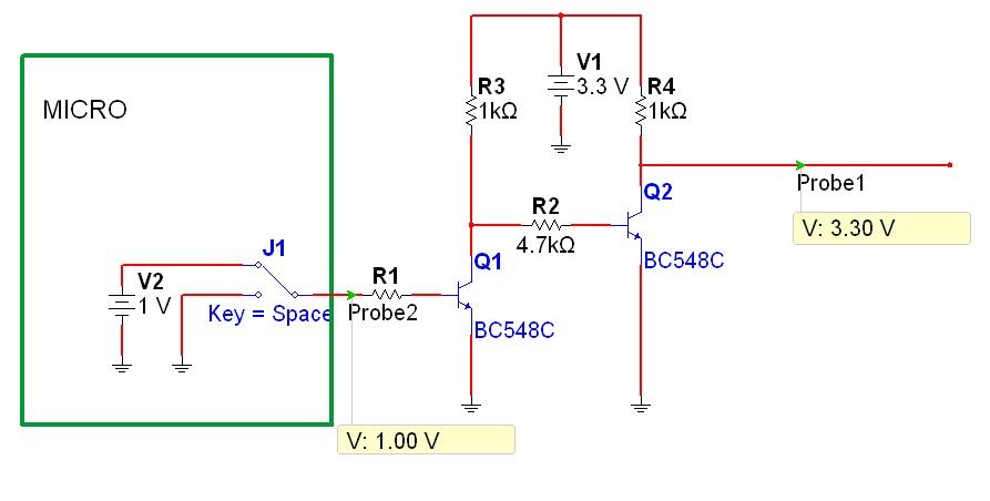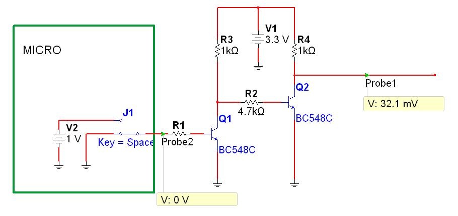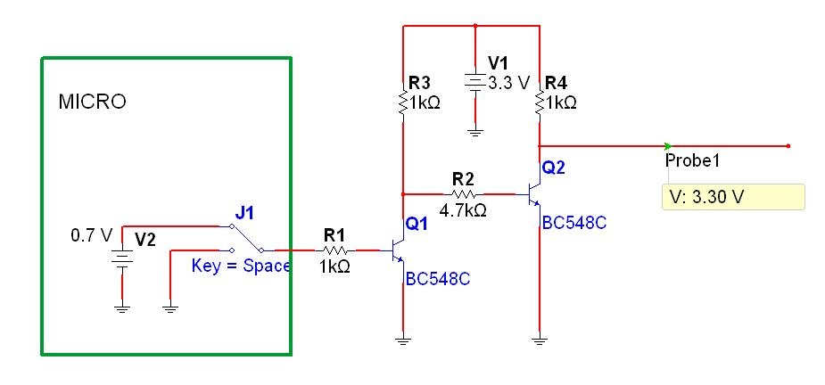 La mínima señal que se puede levantar fácilmente por un circuito a transistor es de 0,7V aproximadamente suponiendo que la tensión de juntura de un transistor de silicio de señal, en saturación, es de 0,65V. En la figura 1.2.1 se puede observar el circuito propuesto con tensión de salida alta y en la figura 1.2.1 con tensión de salida baja.