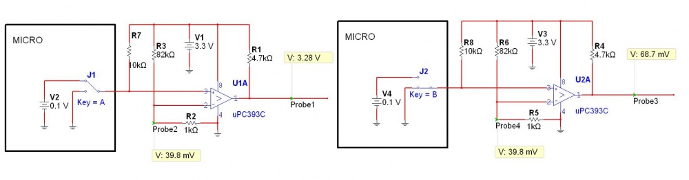 Ahora dejando el valor de R3 fijo en unos 100K elegimos el de R2 para obtener la tensión deseada de 0,32V. Lo puede hacer por tanteo midiendo con el tester o calcularlo del siguiente modo. Sobre el resistor R3 se aplica una tensión que depende de la fuente y de la tensión de cruce. En nuestro caso se aplican 3,3 – 0,32 = 3V aproximadamente. Eso significa que circulará una corriente de 3V/100.000 = 30 uA. Ahora solo queda hallar el valor de resistencia tal que cuando le circulan 30 uA genera una tensión de 0,32V es decir R2 = 0,32/30 uA = 10,6 K aproximadamente. Esto significa que elegimos un valor nominal de 10K.