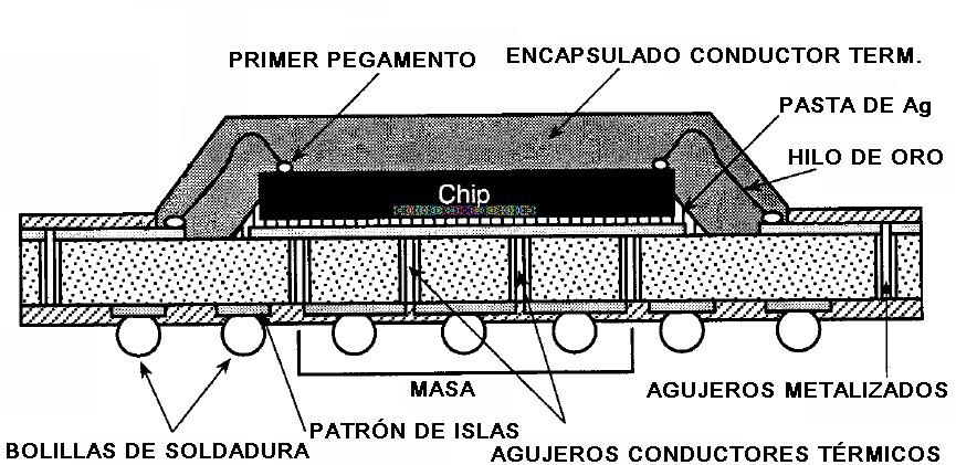 Lo mas importante para nosotros es las posibilidad de reparación de esta tecnología. Con el SMD alcanza con una simple pistola de calor y una punta fina para el soldador. Inclusive se puede obviar la pistola de calor y trabajar solo con "soldadura de bajo punto de fusión" y un soldador común como enseñamos en nuestros cursos de Eprenda. Con el BGA la pistola de aire caliente es imprescindible, porque es el único modo de calentar la capsula del BGA para que el calor llegue hasta las bolillas. Ver la figura 0.4.1. ![]() Fig.0.4.1 Un BGA por dentro El encapsulado punteado es conductor del calor y el negro aislante. Por lo tanto el aire caliente que toca en el encapsulado externo llega hasta la plaqueta intermediaria (que también es conductora del calor por ser de epoxi vidrio) y funde las bolillas rápidamente. Pero el procedimiento no es fácil de implementar y se requiere práctica para lograr una buena desoldadura y su posterior soldadura con nuevas bolillas (reballing) sin quemar el chip. ¿Pero es posible realizar el procedimiento con una pistola de calor? Si se trata de BGA de dimensiones comunes la respuesta es un "si" rotundo, en tanto uno tenga suficiente experiencia. Ahora para BGA con bolillas de 0,3 mm ya se pone muy difícil y se debe recurrir a una máquina. Seguramente Ud. estará pensando ¿Por qué desoldar y soldar el mismo integrado?. La respuesta tiene una historia que contaremos para terminar con este artículo.