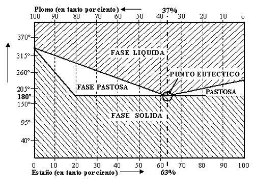 El alambre de soldadura que Ud. usa todos los días es una aleación de 63% de estaño y 37% de plomo. ¿Y porque estas proporciones tan particulares? Le proponemos un trabajo práctico para demostrar las propiedades de esta aleación. Haga un agujero de 10 mm en una madera para usarlo como crisol. Funda soldadura en ese agujero y permita que la misma sobrepase la temperatura de fusión en unos cuantos grados (va a necesitar un soldador de por lo menos 60W). Clave un pequeño clavo en una maderita que va a usar para revolver la soladura fundida. Comience a revolver y verá que resulta sencillo hacerlo hasta que el liquido llega a la temperatura de fusión y entonces se solidifica de golpe sin pasar por un estado pastoso o grumoso. Pasa de líquido a sólido instantáneamente, porque se trata de la proporción llamada eutéctica. Cualquier otra proporción pasa por un estado pastoso intermedio a la solidificación total. Si tuviera una barra de soldadura de hojalatero que es de 50% de estaño y 50% de plomo podría comprobarlo y terminar el trabajo práctico. Hace unos 5 años Europa prohibió la entrada de productos con plomo, por considerarla una sustancia peligrosamente poluciónante (produce una enfermedad mental llamada saturnismo). Hasta ese momento todos los BGAs se soldaban con bolillas de aleación eutéctica y no se registraban problemas de soldadura. Pero a partir de allí se comenzó a usar estaño solamente con el consiguiente problema de una mayor temperatura de fusión y con un estado pastoso muy prolongado tal como puede observarse en la carta de aleación de la figura 0.5.1.