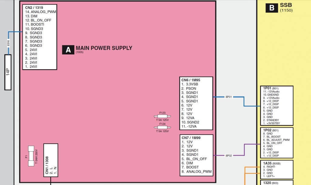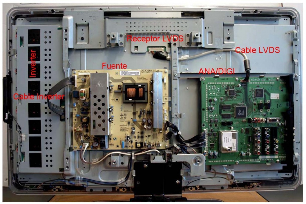 Sintéticamente consiste en una fuente en la parte central; una plaqueta que es una combinación de los circuitos analógicos, digitales y el micro que comúnmente llamamos ANA/DIGI y que Philips llama SSB ( Slow Signal Base = base de señales pequeñas) que se conecta por abajo a la izquierda con la fuente y arriba con un cable multipar LVDS con el receptor LVDS (Low Voltage Diferential Signal = señal diferencial de baja tensión) que además posee un circuito integrado conversor CC a CC que alimenta a la pantalla y que no aparece en los circuitos, por ser considerado perteneciente a la pantalla.