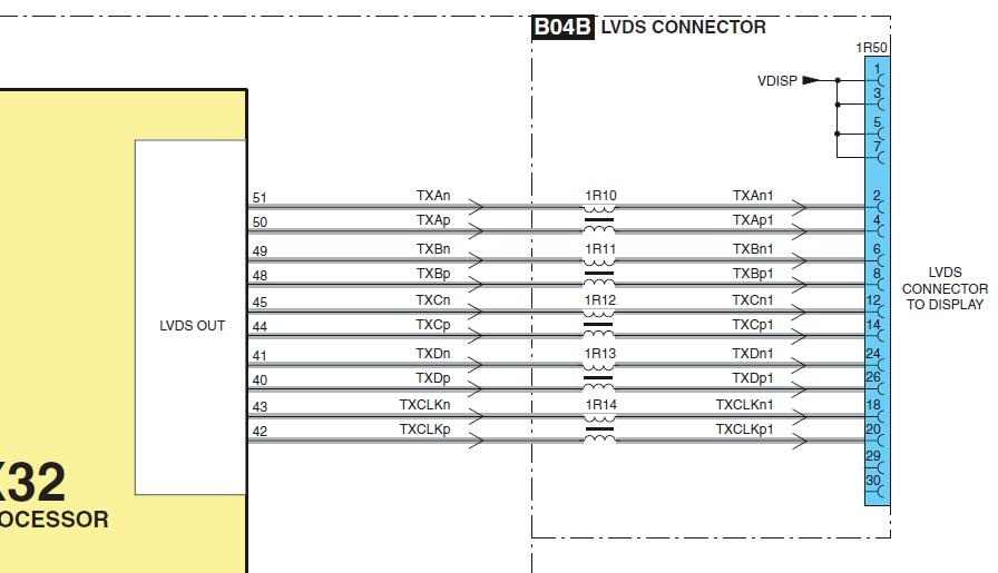Los terminales 1 a 7 del conector 1R50 se encargan de la tensión de fuente de la pantalla que es de 12V y esta mencionada como VDISP y las patas 29 y 30 son la masa de fuente.