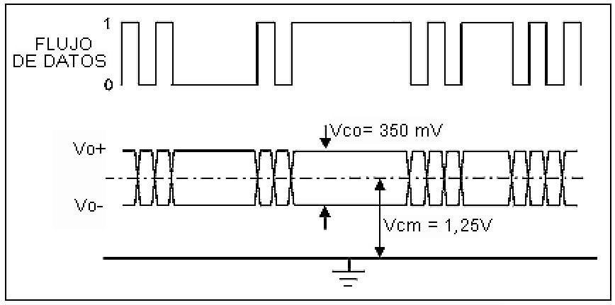 - La señal LVDS tiene una componente continua y una alterna. Si te falta la continua significa que el link esta abierto; no necesitas medir la alterna. En cambio si la continua esta bien tenés que hacer mediciones con la sonda de RF. La tensión continua de polarización de los receptores LVDS es generalmente de 1,25V y se debe medir en los dos cables del par a lo largo de todo su recorrido. En nuestro caso debes tomar masa en la plaqueta del receptor LVDS y medir sobre el circuito impreso del conector del receptor. En la figura 5 se puede observar las tensiones que indican la norma para las señales LVDS aunque hay que aclarar que la amplitud de señal depende de las perdidas del multipar. No así la continua que es un valor normalizado.
