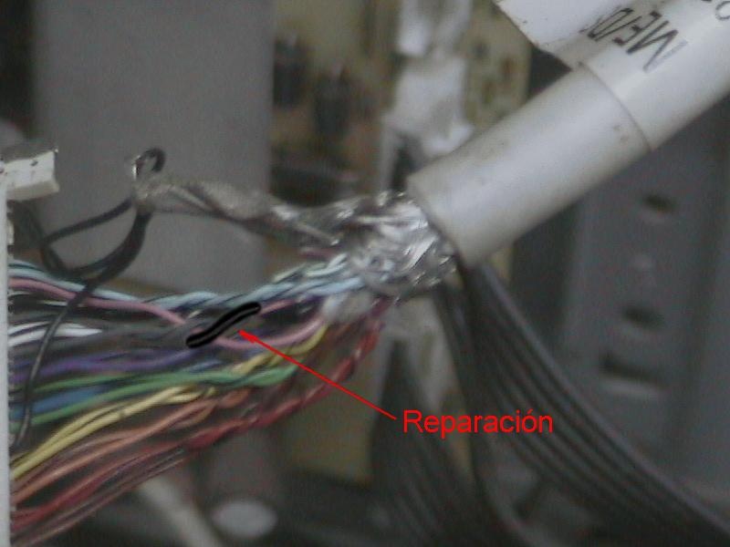 Del otro lado, la terminación de los cables esta tapada con cinta y no se puede ver mucho. Así que saque la cinta y observe que el cable estaba muy flexible al salir de la manguera. Moviéndolo con la pinza de punta logre que diera continuidad, así que lo termine de cortar, pele las puntas lo soldé y lo cubrí con espagueti termocontraible. Ver la figura 6. Saqué una fotografía de la reparación y volví a cubrir todo con cinta.