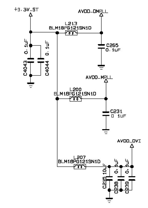 Podemos ver un ejemplo en la figura 1.1 de un TV LG M2550D en donde se observan todos los componentes de filtrado que hay sobre la fuente +3.3V_ST.