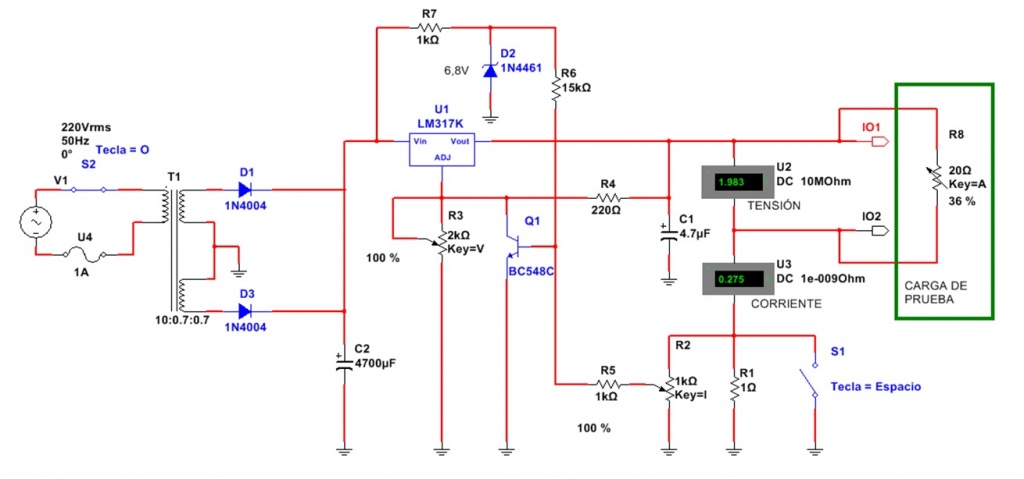 A esta fuente me refiero cuando digo que es una fuente inteligente. Porque hasta cierta corriente es una fuente de tensión y a partir de allí es una fuente de corriente. Lo importante es que no se apaga, sino que reduce su tensión, lo cual nos permite reparar el circuito.