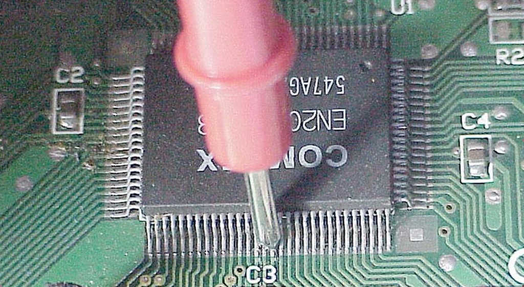 Dicen que una imagen vale más que mil palabras. Por eso le mostramos la fotografía de la figura 2.1.1 en donde se puede observar una punta de tester normal midiendo sobre una pata de un circuito integrado SMD de pequeño paso (aunque hay menores aun).