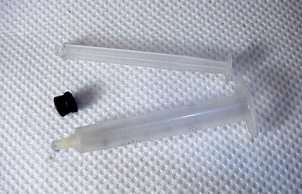 Compre dos jeringas hipodérmicas de las mas pequeñas (para bebes) con sus correspondientes agujas; se trata de jeringas de 1 cm3 con una aguja muy fina y flexible (tanbien se conocen por "tuberculina"). Retire el embolo de plástico y sáquele la gomita que oficia de pistón. Realice un agujero a la gomita para que pase el cable. Ver la figura 2.2.2.