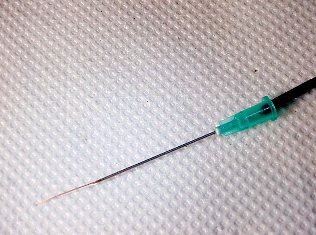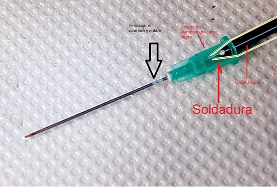 En la foto se ve un alambre muy largo que llega a sobresalir de la aguja, pero con que llegue hasta la mitad de la misma es suficiente y luego apriete la aguja en dos lugares, cerca del plástico, con un alicate o con una pinza. De este modo la aguja se deforma, de modo que realice presión sobre el alambre.