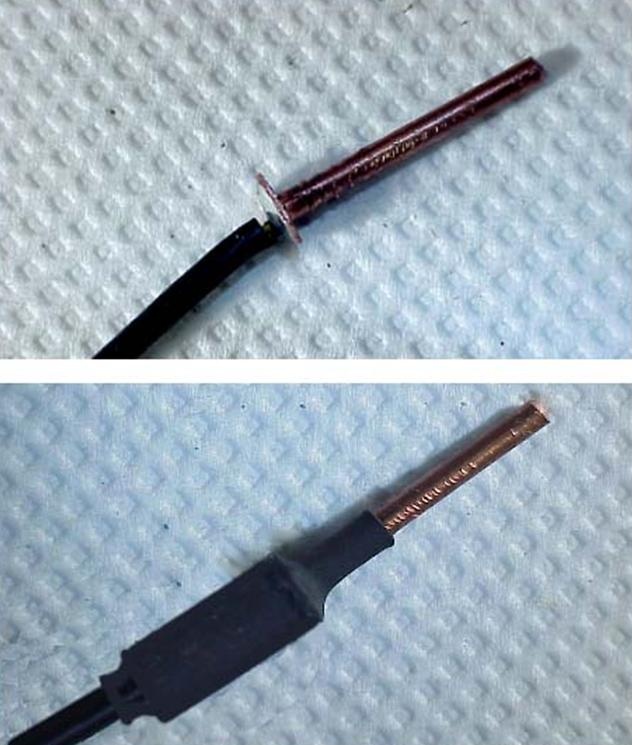 Si no va a usar los cables y las fichas banana del tester busque un alambre de cobre, en lo posible estañado, que entre casi sin huelgo dentro de la aguja. Estos alambres pueden ser tomados de un fusible al que se le rompe el tubo de vidrio para desarmarlo; no es necesario que el alambre sea muy largo. usar el alambre de un fusible es lo mejor, ya que son alambres de cobre bañados en plata por electrólisis.