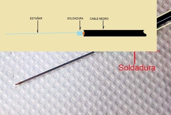 Tome el alambre y suelde ese trozo en la punta del cable elegido, negro o rojo . Pase el cable, con su alambre soldado en la punta, por la jeringa sin aguja y luego coloque la aguja en el cuerpo de la jeringa por adelante pasando el cable ya soldado por el cuerpo de la jeringa. Ver la figura 2.2.3.