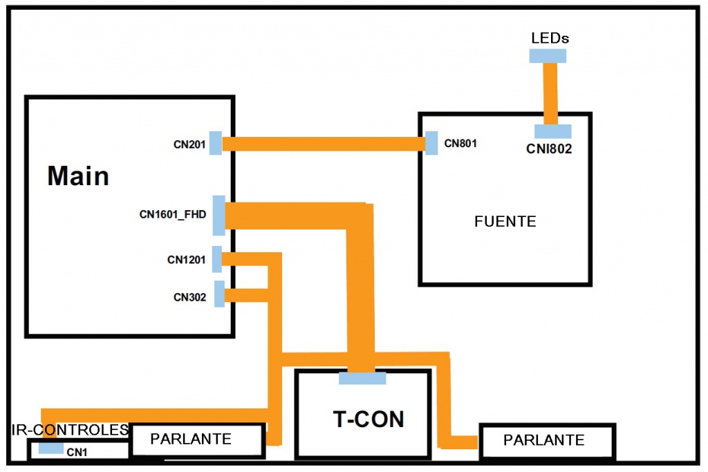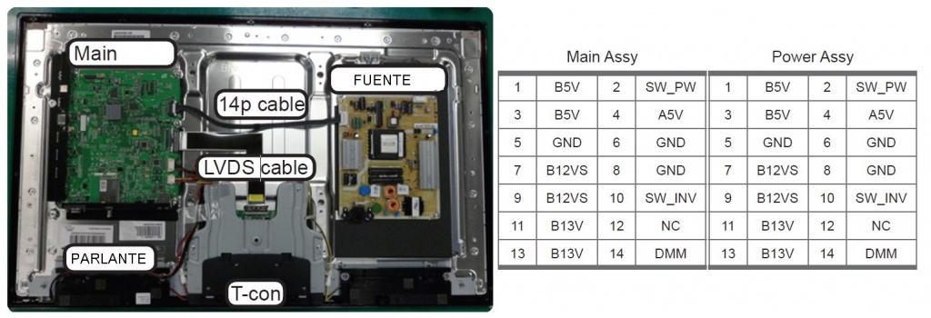 La distribución es absolutamente clásica con una plaqueta main, una fuente que contiene al driver de LEDs y una T-COM que se conecta directamente a la pantalla sin conectores intermedios. La fuente se conecta a la main por una manguera de 14 cables y la main se conecta a la T-COM con un flex. El nombre de cada cable se puede observar al costado de la fotografía tanto del lado de la main como del lado de la fuente. Ver la figura 1.3.1.