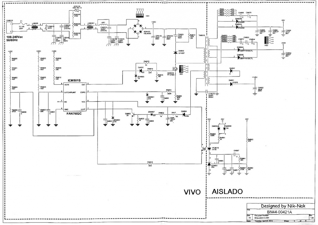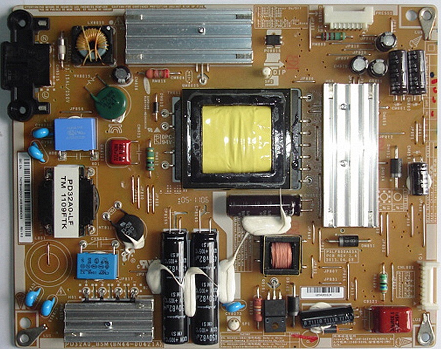 La fuente de alimentación no la fabrica Samsung y por ello no está indicada en el manual de service. Se trata de una fuente genérica Coreana que tiene varios fabricantes y que lleva el código BN44-00421A y que mostramos en la figura 1.4.0.