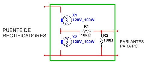 Fig.1.4.3 Carga para prueba de rectificadores de red. Nota: Esta carga depende de la tensión de red de su lugar de residencia; el circuito mostrado es para 110V en lugares con 220V se deben usar lámparas de 220V. Las lámparas deben ser del tipo incandescente o halógenas.