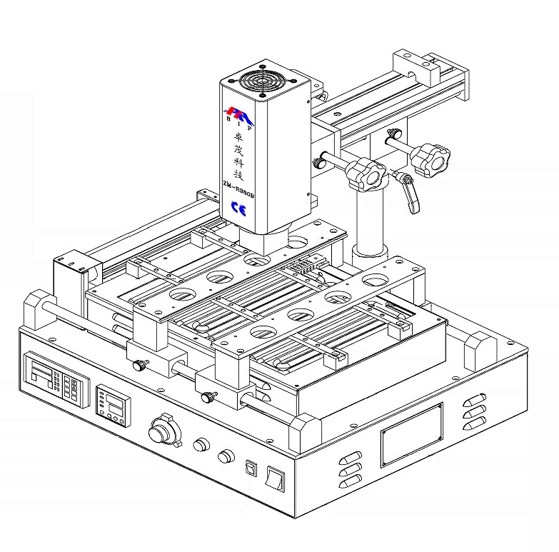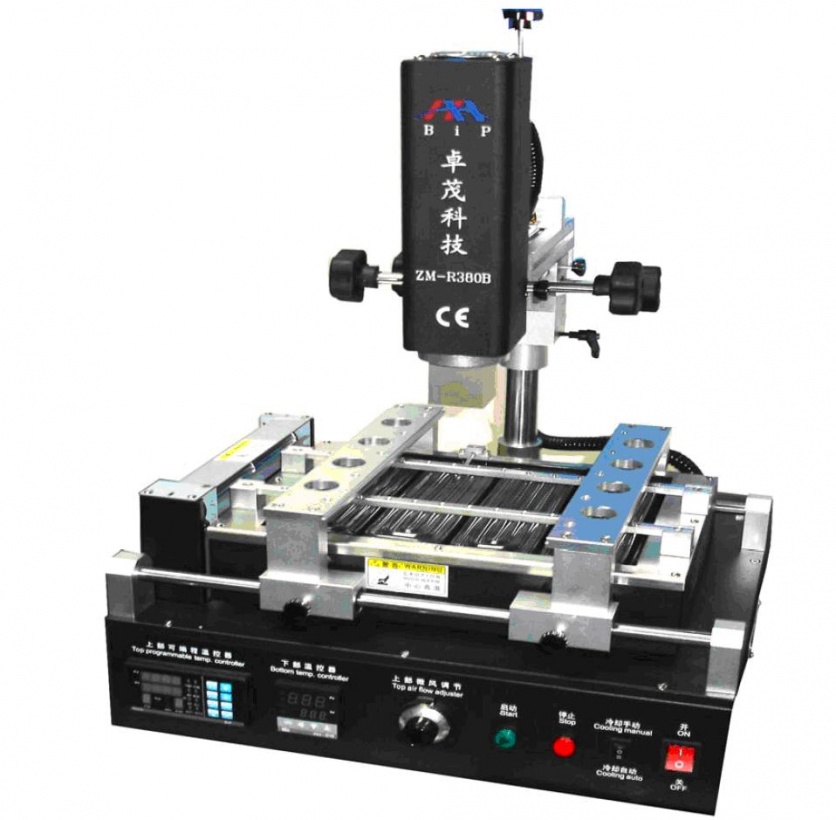 Fig.1.4.1 Clásica máquina de Reballing Como se puede observar la máquina puede dividirse en una parte superior por arriba de la plaqueta y una inferior por debajo de la misma. El flujo superior se puede orientar y dirigir además de cambiar la temperatura del aire el caudal y la sección. Cuando decimos ajustables en realidad deberíamos decir programable, porque la mayoría de las máquinas de primera marca poseen algún tipo de programador que ajusta tiempos, caudal y temperatura de la fuente de aire caliente, superior e inferior. Esta unidad de control está incorporada en la parte inferior de la máquina. Las buenas maquinas poseen además un cable generalmente para el puerto USB de una PC para permitir memorizar y controlar el proceso desde la misma. Esto se llama trazar un perfil térmico porque se puede ajustar el momento en que se enciende el calefactor inferior; la velocidad de crecimiento de esa fuente de calor; el tiempo que permanece encendida, el momento en que comienza a bajar la temperatura inferior y su velocidad de decrecimiento. Paralelamente se puede programar el momento en que se enciende la torre calefactora superior. El ritmo de crecimiento de su temperatura, el tiempo en que permanece encendida y el ritmo de decrecimiento de la temperatura. En una palabra, que las bolillas de soldadura se calientan desde el circuito integrado y desde la plaqueta de circuito impreso y esas dos vías hacen una enorme diferencia con el proceso manual alejando al chip de las temperaturas peligrosas. 1.4 CONCLUSIONES En esta primera parte presentamos el problema de la soldadura de los BGA en la segunda parte vamos a explicar porque el doble calentamiento reduce el peligro para el chip. La fotografía de la máquina mostrada en este artículo es el modelo ZM-R380B de la firma SHENZHEN ZHUOMAO TECHNOLOGY CO. , LTD. A la cual agradecemos su gentileza. SALIR Más SOLDADURAS BGA
