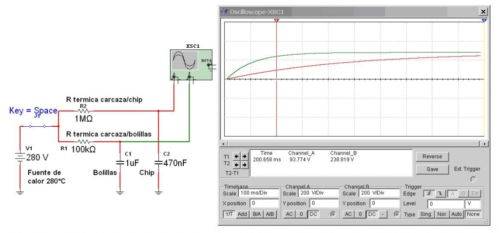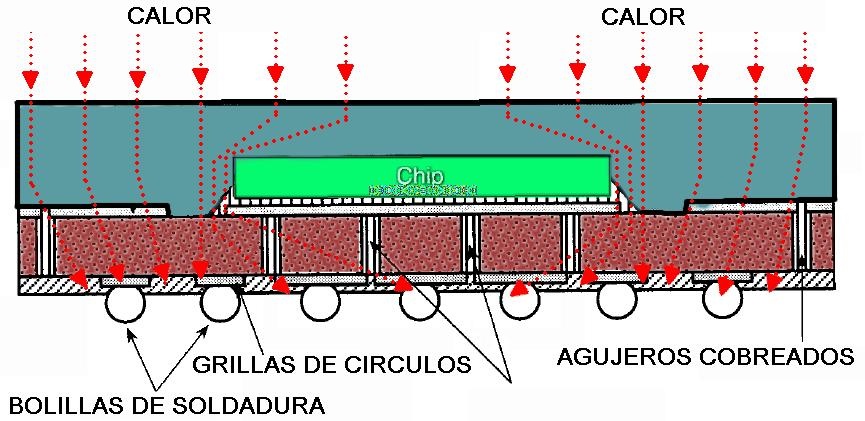 Como ya sabemos un BGA es un circuito integrado que se conecta a la plaqueta de circuito impreso por medio de bolillas de soldadura. No hay patitas metálicas rígidas, conectores u otros elementos de conexión. Toda la plaqueta base del BGA está llena de islas circulares coincidentes con islas similares de la plaqueta del equipo. Es decir que hay un sándwich de islas de cobre con bolillas de soldadura intermedias. Esta disposición puede observarse en la figura 1.2.1. ![]() Fig.1.2.1 Interior de un BGA clásico Como vemos el calor que llega a las bolillas de soldadura lo hace rodeando el encapsulado relativamente conductor del calor, cuando viene desde arriba y debe atravesar una placa de circuito impreso que se busca que sea lo mas conductora posible del calor mediante agujeros metalizados y material de epoxi glass (placa base del BGA). El chip está rodeado de un plástico aislador del calor como si estuviera en un capullo protector. Por supuesto que la protección del capullo no es eterna. En cierta forma el calor se comporta como las cargas eléctricas; los materiales poseen una resistencia térmica y el chip una capacidad. Las cargas no llegan inmediatamente al chip pero si se espera lo suficiente se establece un estado de equilibrio térmico que puede quemarlo inexorablemente. Todo esto puede ser representado como un circuito eléctrico en donde la masa de las bolillas y el chip se representan como capacitores y los encapsulados como resistores. Ver la figura 1.2.2. ![]()
