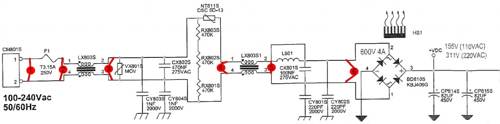 Este circuito posee dos celdas de filtrado para mejorar el fenómeno de la interferencia inducida en la red por la fuente y para aumentar la inmunidad al ingreso de señales interferentes por la red. Se puede observar que cada transformador paralelo (LX803S y LX803S1) posee un capacitor de sintonía CX802S y CX801S. El choque L801 que parece tener un cortocircuito es en realidad un núcleo con un alambre pasando por su agujero que sirve como filtrado de pulsos de muy corta duración generado durante las tormentas eléctricas.