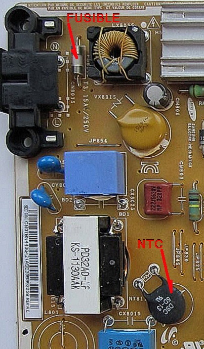 El reemplazo del termistor NTC es más difícil de resolver. El nombre nos indica sus características principales DSC es la marca y es de 5 Ohms a 20ºC con un diámetro de 13mm. Ud. no se imagina la cantidad de TVs que nos llegan con un puente de alambre en lugar de este componente y con el puente de rectificadores en cortocircuito y por supuesto el fusible quemado.