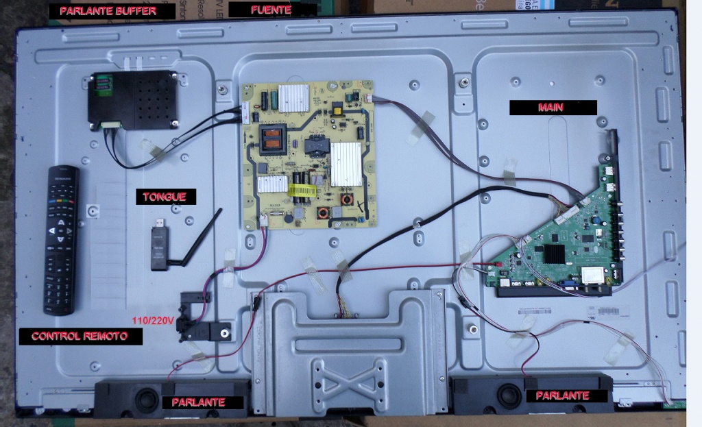 Se puede observar que solo posee dos plaquetas: fuente y main y que las mismas no tiene más tamaño que una plaqueta de TV LED y es lógico porque el tamaño de la fuente depende sobre todo de la potencia tomada por la pantalla y esta es la misma para un Smart que para un LED a igualdad de tamaño. Las mayores diferencias están en la existencia del Tongue el amplificador buffer de audio en la plaqueta fuente y un control remoto con más pulsadores.