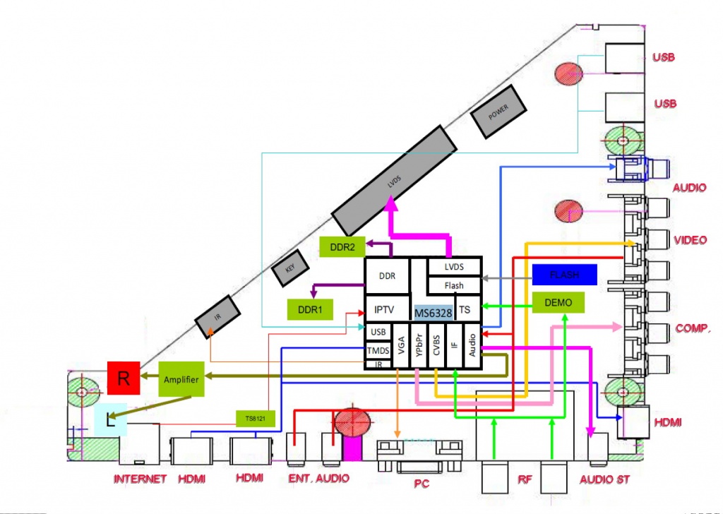 Los conectores de borde colocados sobre el borde inclinado son de arriba abajo el de fuente de 6 patas, el de LVDS con 2 puertos de 4 pares y el rojo y negro para alimentación, el de piloto y control local el de la entrada de control remoto y el de los parlantes izquierdo y derecho.