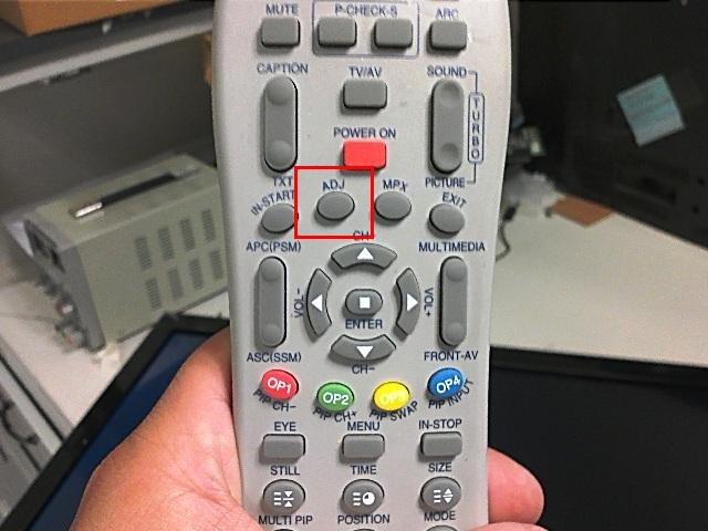 Primero debe entrar al modo service. Tome el remoto y encienda el TV. Luego pulse la tecla ADJ y marque 0413 con las teclas numéricas. Ver la figura 9.5.1.