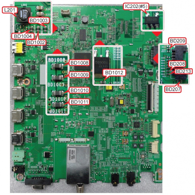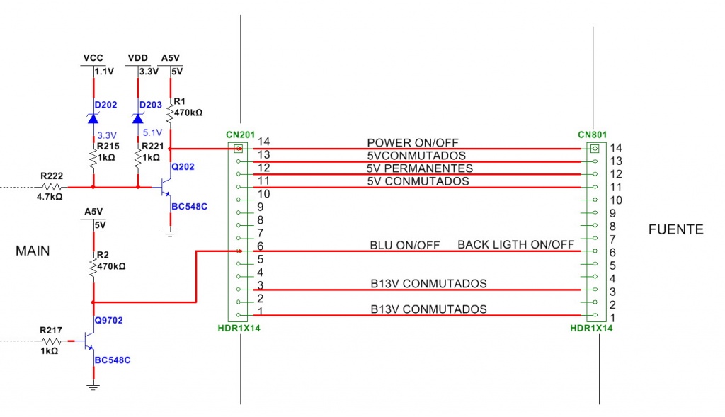Controlar las fuentes conmutadas de uso general B13V y B5V en los siguientes puntos de prueba 13V en BD209 y 5V en BD213. Como estas tensiones vienen directamente desde la fuente, la falla solo puede estar en el cable de fuente