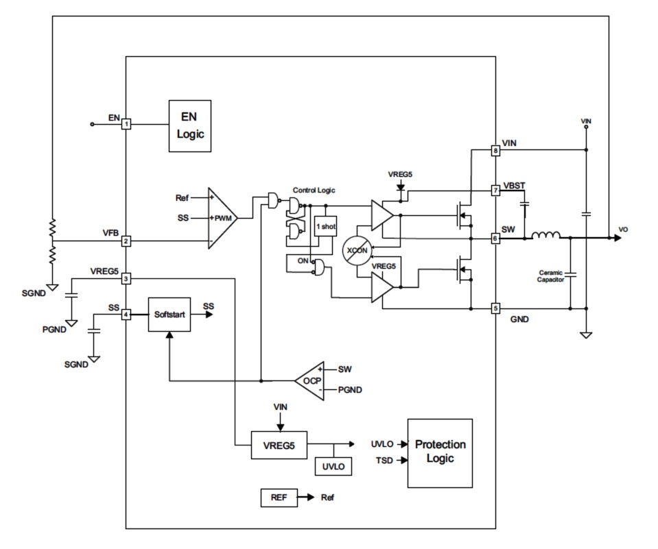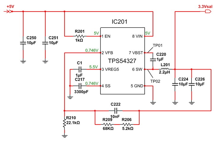 Aquí podemos observar algunas características importantes del circuito como por ejemplo que la entrada de 5V de CC se aplica entre la pata 8 y la 5 (masa). Y la salida entre el terminal derecho del inductor principal L201 y la misma masa de la pata 5. Esto significa que no hay aislación galvánica entre entrada y salida (que además no se necesita en este caso).