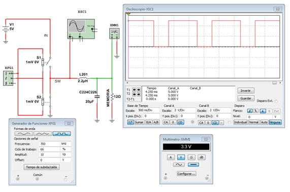 Según el data sheet éste integrado funciona a una frecuencia fija de 700 KHz. En la simulación por lo tanto ponemos un generador de señales rectangular de 700 KHz, cuyo periodo de actividad cambia en función de la tensión de salida, realimentada por un divisor de tensión que opera sobre el tiempo de actividad del generador de modo que si la salida aumenta el tiempo de actividad disminuye. Esa pata de entrada de realimentación es la pata 2 que se conecta a la salida de 3,3V por un atenuador de precisión.