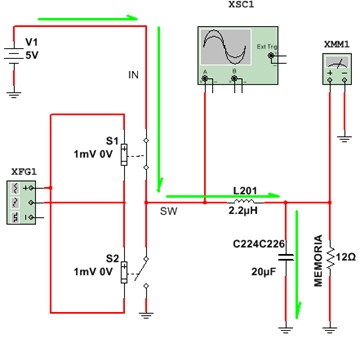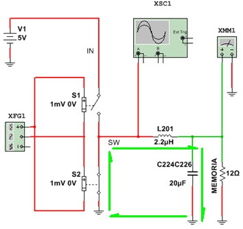 Analicemos el funcionamiento comenzando con un tiempo de actividad del 50%. Al cerrarse S1 comienza a circular corriente por L201 generando un campo magnético y la carga de C224 en paralelo con C226. Ver la figura 2.3.3.