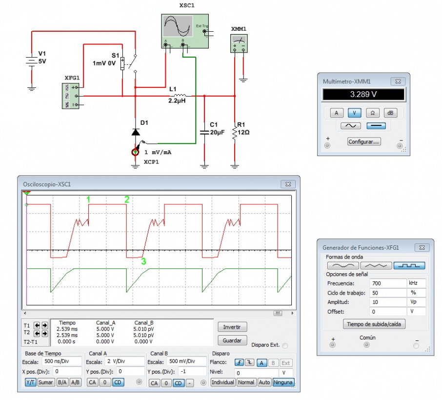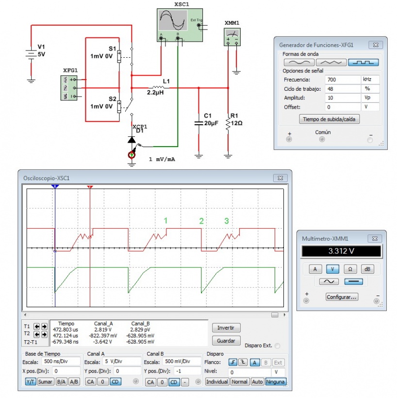 En 1 se cierra la llave superior y comienza a circular corriente por el inductor hacia la carga, levantando la tensión de salida y generando un campo magnético en el inductor. En este momento la llave inferior está abierta. El oscilograma durante el tiempo 1 debe estar permanentemente a la tensión de fuente (5V).