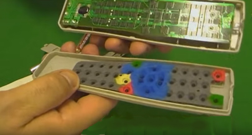 Era un control remoto de lo más normal que tiene una plaqueta de circuito impreso con contactos en peines que se cortocircuitan al ser apretados con un círculo de goma conductora. Ver la figura 1.1.1.