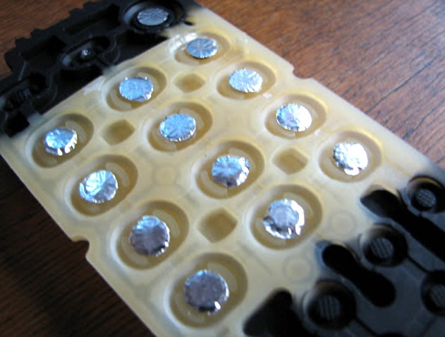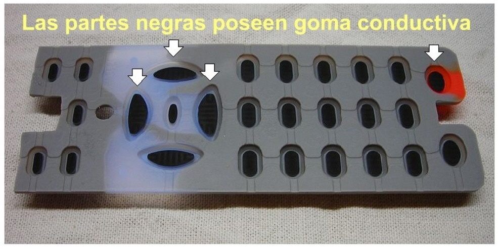 En la figura 1.6.1 mostramos el detalle de una plantilla de contactos. El material de base es silicona del mismo tipo que la usada para prótesis. Pero la silicona es un aislante. Por lo tanto en cada botón se pega un trocito de goma conductiva que es la que realmente cierra el contacto del circuito impreso.
