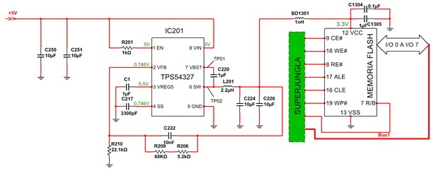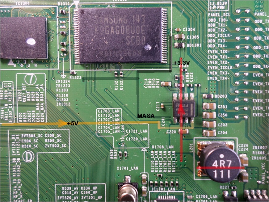 Observe que en el medio de los capacitores esta el inductor fusible BD1301. Si hay un cortocircuito en la memoria o en C1304 o C1305 seguramente el fusible estará abierto aunque todo depende de la corriente de corte del CI que es fijo ya que el circuito equivalente al resistor shunt que lo ajusta es interno a IC201.