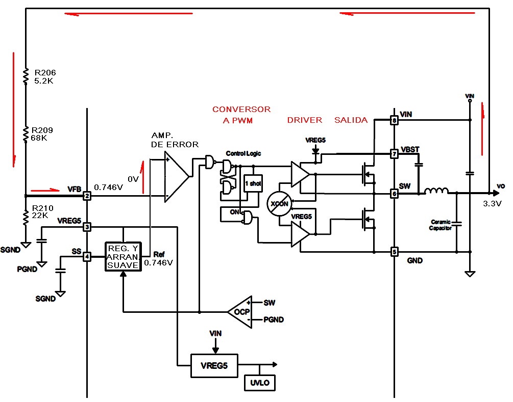 En una palabra que los 3,3V de salida se atenúan hasta 0,75 V aproximadamente y se introducen por la pata VFB que es la entrada - del operacional amplificador de error. La pata + de este amplificador se conecta a una tensión de referencia muy exacta (interna al CI) por lo que el operacional se comporta como un comparador.