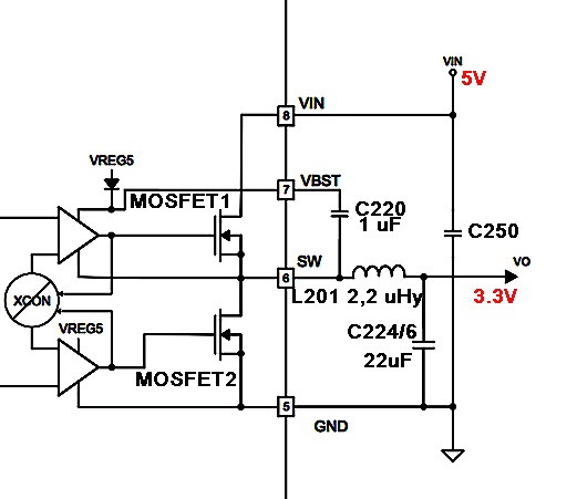Pero en el MOSFET 2 el terminal de fuente vuela junto a la salida hasta un máximo de 5V y entonces no puede ser excitado desde la fuente interna de 5V. La fuente de su operacional excitador debe se reforzada y lo es con el capacitor de boostrap C220 que acopla la salida a la fuente del excitador sumándola a los 5V con el diodo VREG5. Este capacitor suma la señal de salida del CI a la tensión de 5V como lo hacían los viejos amplificadores push pull de audio.