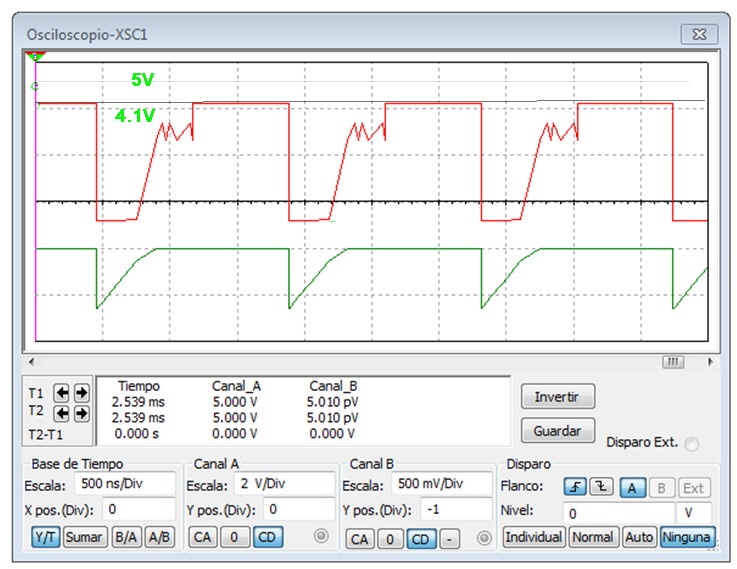 Si se abre el capacitor C220 no se produce el refuerzo y el MOSFET1 solo queda bien excitado hasta que la salida supere los 5V. Eso provoca una falta de amplitud de la salida que puede observarse en la figura 3.5.2.