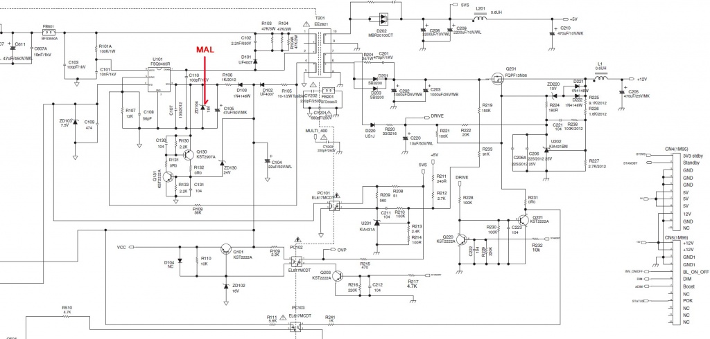 El segundo sospechoso es la fuente de baja tensión del U101. Que en este caso tiene de todo colocada sobre ella (pata 2 de U104). Si colocamos nuestra fuente variable inteligente (gratis en Http://www.picerno.com.ar/leer.php?cn=45) ajustada a una corriente de 500 mA, sobre la pata 2 y la levantamos desde cero volt. Veremos que la tensión debe subir hasta el valor de zener del diodo ZD104 pero en este caso solo llegábamos hasta 5V aproximadamente. Desoldamos ZD104 y lo probamos en el aire y tiene el mismo comportamiento. Conduce en 5V. Lo cambiamos por un zener de 18V y se resuelve el problema.